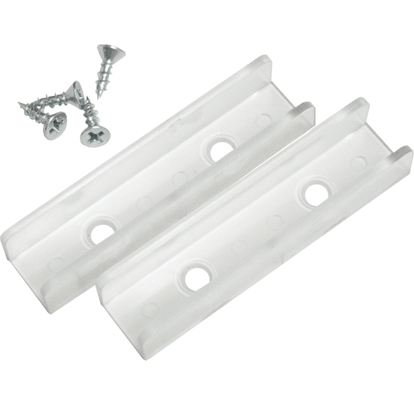 Divider Clips and screws for installing 1/2" thick drawer and pullout shelf dividers. These clips are made of hard, clear plastic and are 2-3/4" in length.